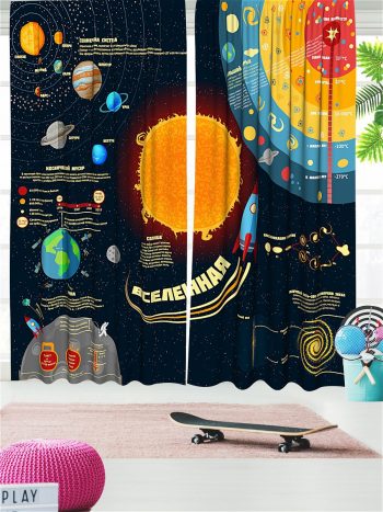 Описание: Два полотна по 145х265 см со шторной лентой , крючки для крепления 40 шт в комплекте.Идеально подойдут в детскую комнату. Материал: оксфорд .